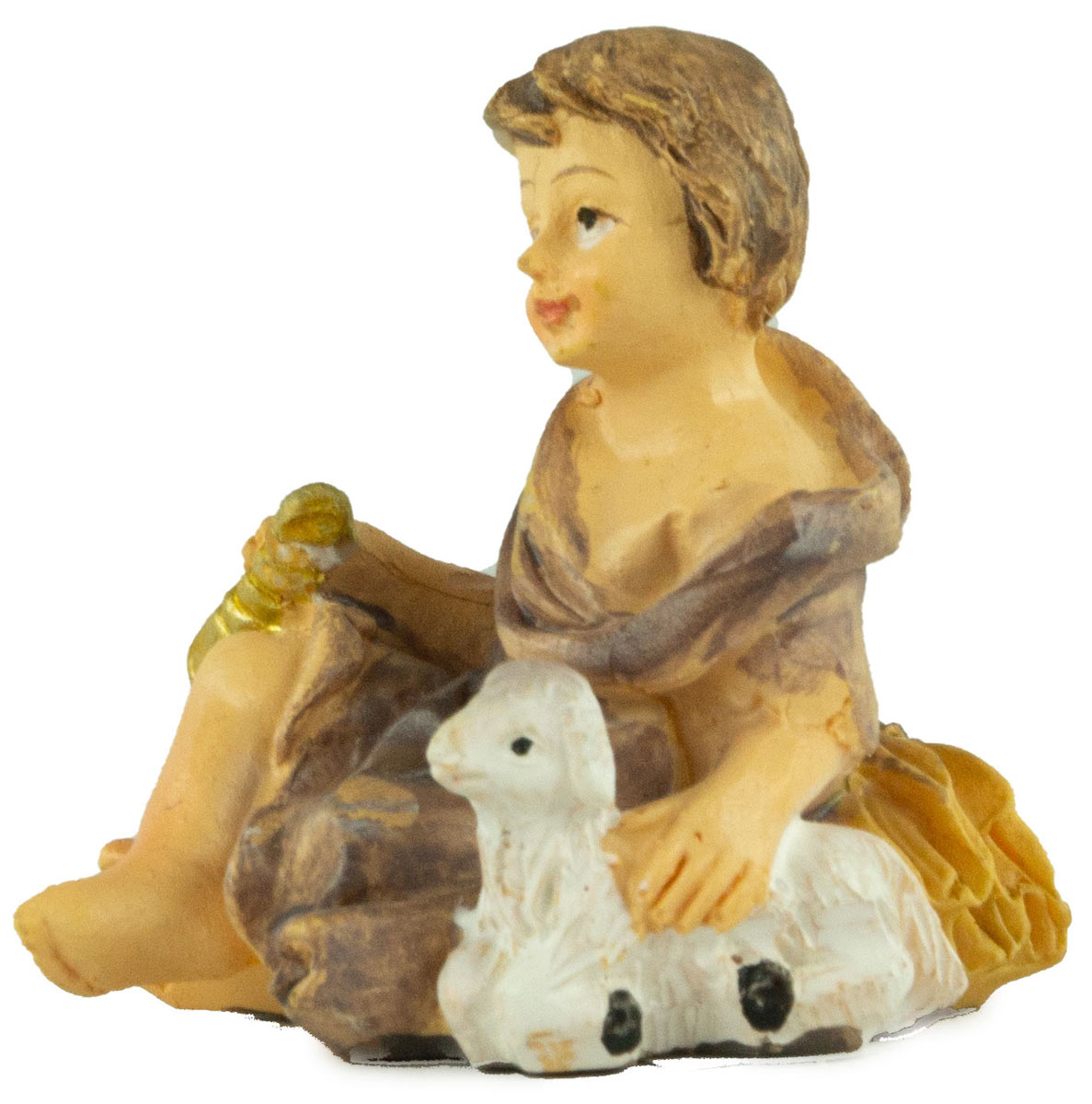 Das Kind trägt ein graues Gewand und sitzt auf dem Boden neben einem Bündel Heu. In seiner Hand hält es ein goldenes Horn. Danaben liegt ein kleines Lamm, welches von dem Kind gestreichelt wird.